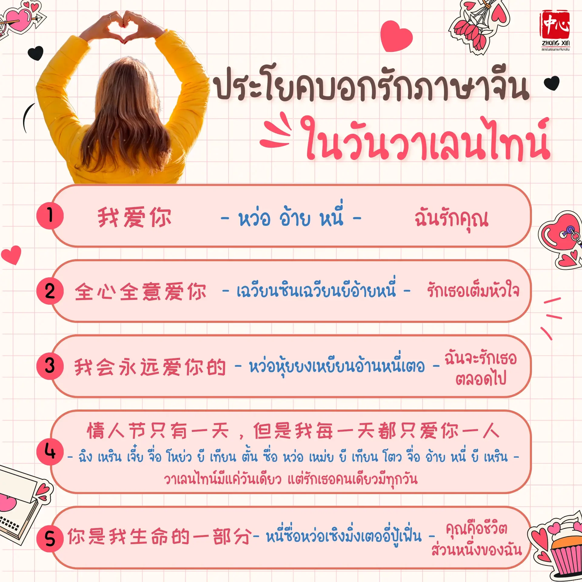 วันที่ 14 กุมภาพันธ์ของทุกปีเป็น ” วันแห่งความรัก ” หรือ Valentine’s Day มีการเฉลิมฉลองในหลายประเทศทั่วโลก วันนี้สถาบันสอนภาษาจีนจงซิน มีประโยคภาษาจีน คำศัพท์ และคำอ่านของวันวาเลนไลน์มาฝาก ลองนำไปใช้เพื่อเขียนเป็นการ์ดหรือส่งเป็นข้อความให้คนที่เรารักได้เลยนะคะ