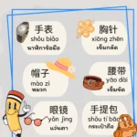 คำศัพท์ที่สำคัญและใช้บ่อยคือ “手表” (shǒu biǎo) แปลว่า “นาฬิกาข้อมือ” และ “戒指” (jiè zhǐ) แปลว่า “แหวน” ค่ะ นอกจากนี้ คำว่า “帽子” (mào zi) แปลว่า “หมวก” และ “腰带” (yāo dài) แปลว่า “เข็มขัด” ก็เป็นคำศัพท์ที่ใช้บ่อยในชีวิตประจำวันและในการแต่งกายค่ะ