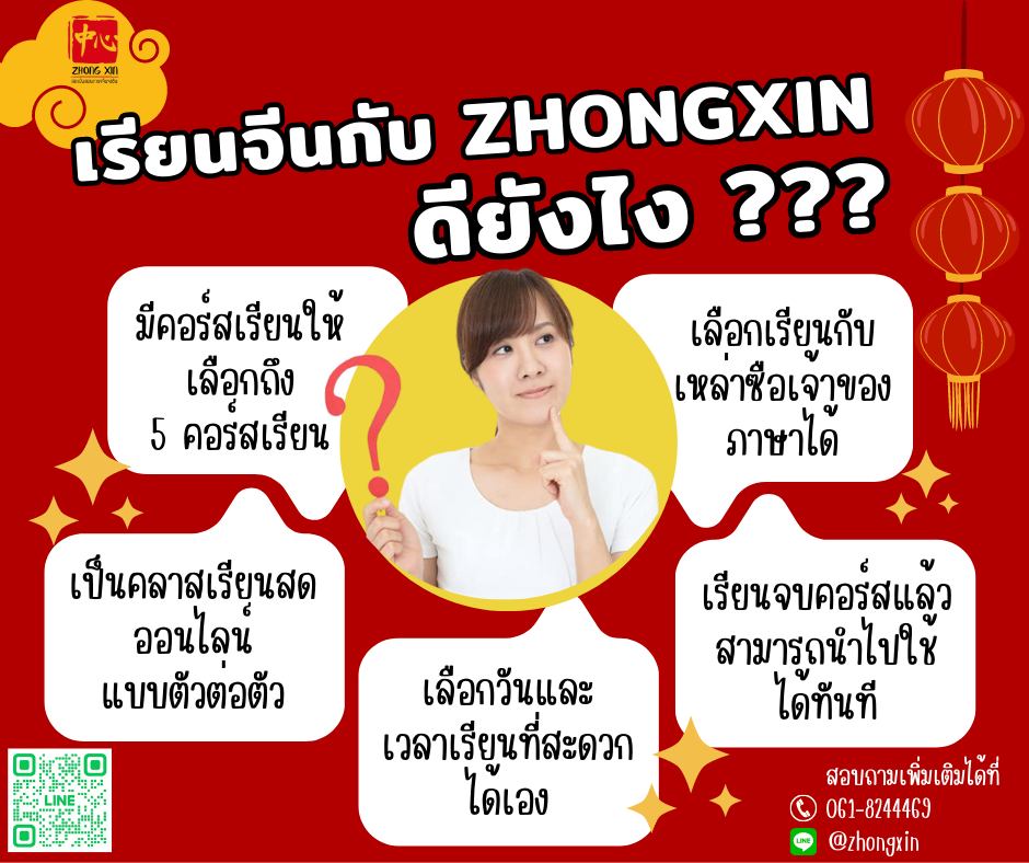 Zhong Xin พร้อมพาคุณพูดภาษาจีนได้จริง ด้วยคอร์สเรียนที่ยืดหยุ่นเรียนตัวต่อตัวกับเหล่าซือจีน /ไทย ครูใจดี และสอนเข้าใจง่าย ไม่ว่าคุณจะเริ่มจากศูนย์ หรืออยากต่อยอด เรามีคอร์สสำหรับทุกเป้าหมายของคุณ